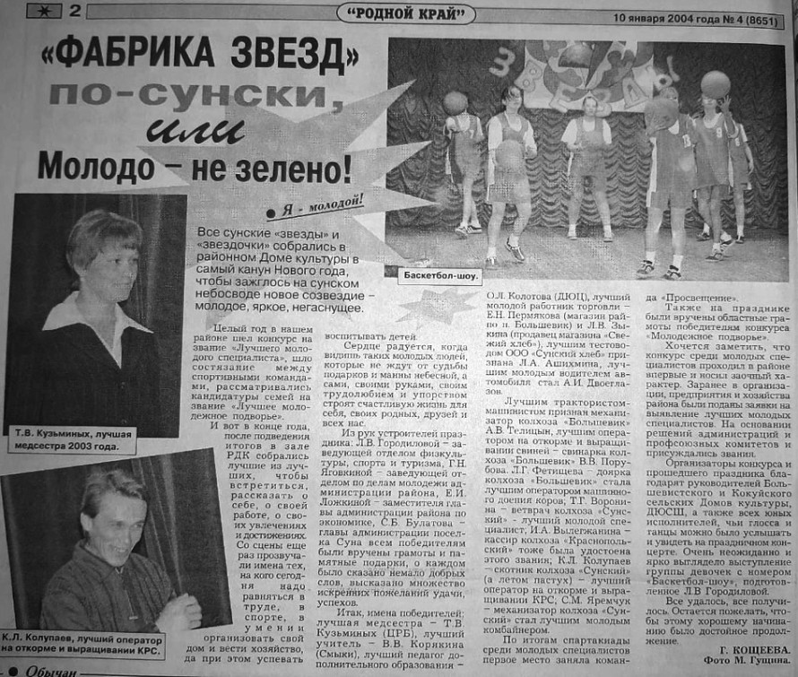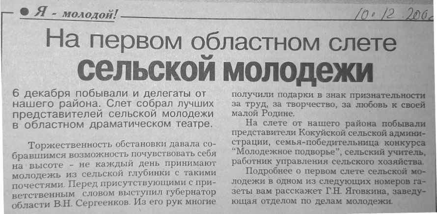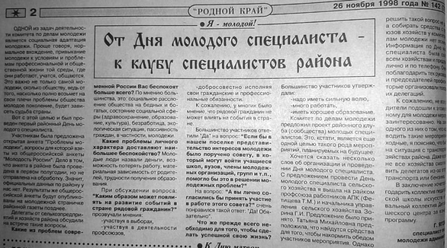 Посмотрите газетные статьи, в которых рассказывается о молодежных достижениях на страничке «Я – молодой!» районной газеты «Родной край». По начатой в 2003 году (20 лет!) традиции, итоги молодежных побед подводились в рамках районного фестиваля «Молодые зажигают звёзды».