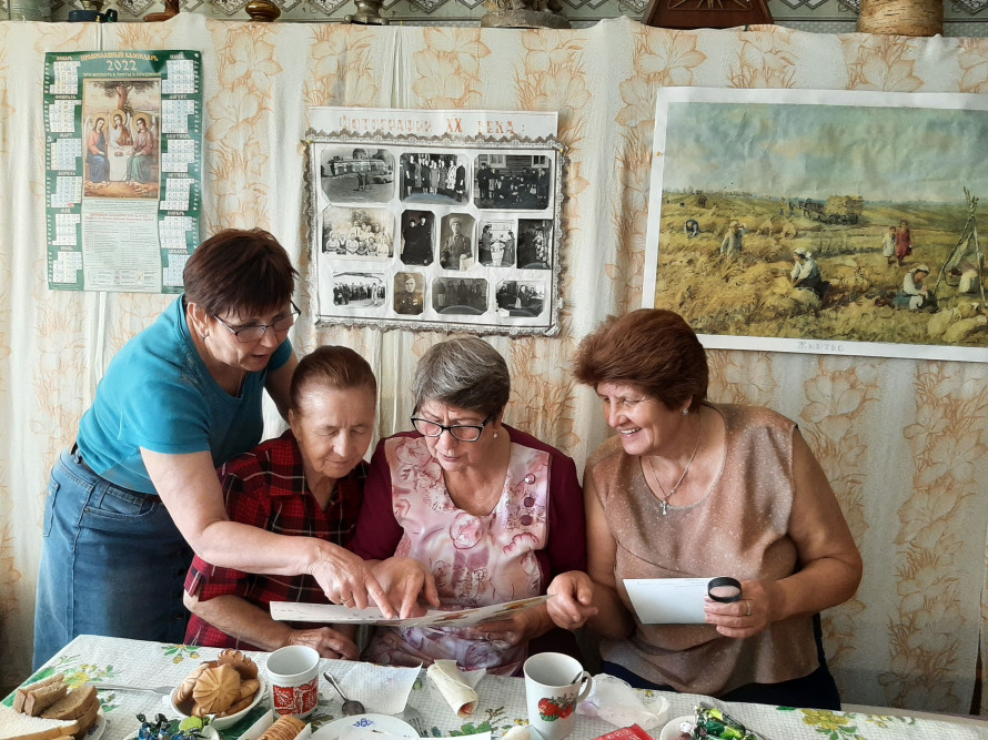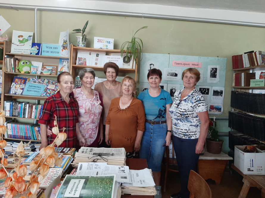 Потом Лидия Николаевна рассказала нам историю восстановления этой части храма, людей, которые помогали делом, деньгами и материалами. Погоревала о том, что все меньше односельчан ходят в церковь, возможно отвыкнув в годы пандемии. Активную общественную жизнь во многом направляют и поддерживают пенсионеры. И наша встреча была организована, как встреча по краеведческой работе с музеем и проектам районной организации ветеранов. Встречали нас, конечно, в библиотеке, где уже хлопотала радушная хозяйка – Людмила Николаевна Попцова.