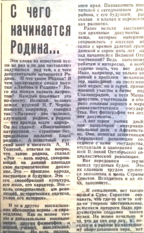 25 ноября 1986 года выходит статья «С чего начинается Родина» в районной газете «Родной край».